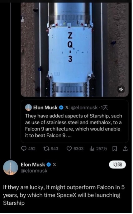 10�日,马斯克在社交媒体发帖评价了近期亮相的我国朱雀三号运载火箭。他认为,这款火箭设计类似于其名下SpaceX的主力载具猎񣁩号,但融合了新一代星舰重型火箭的液氧甲烷染料、不锈钢箭体等设计,因此其未来有可能超越猎񣁩号。